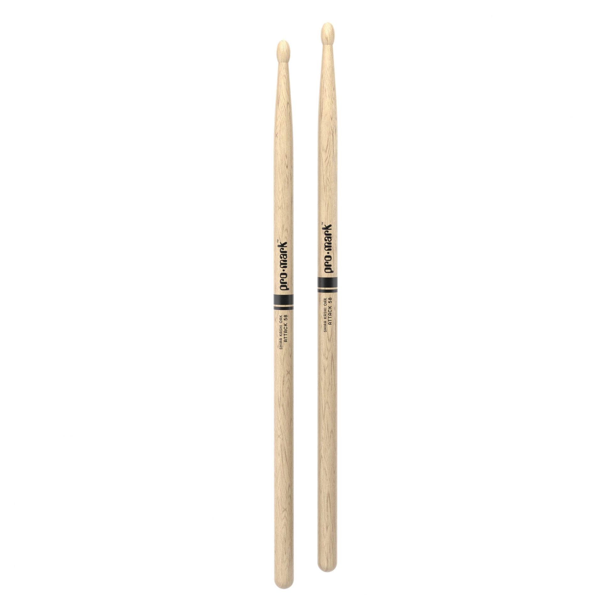 The ProMark Classic Attack 5B drumstick features an oval tip shape, short taper, and dense Shira Kashi Oak, producing a forward-weighted feel with increased power and durability.